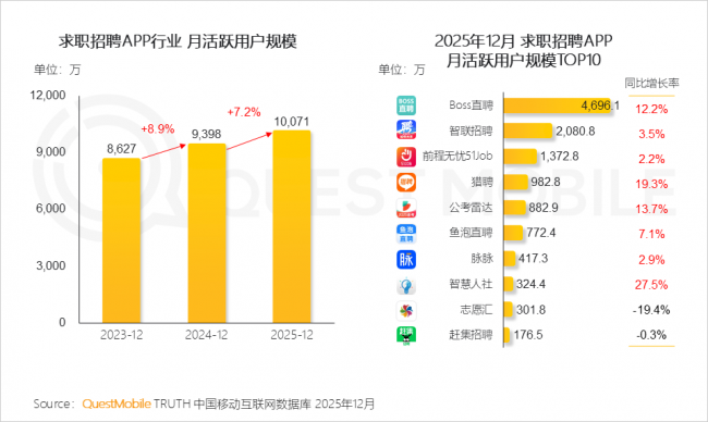 QuestMobile数据显示,2025年12月,Boss直聘、智联招聘、前程无忧51Job APP月活跃用户规模同比分别增长12.2%、3.5%、2.2%,达到4696.1万、2080.8万、1372.8万。