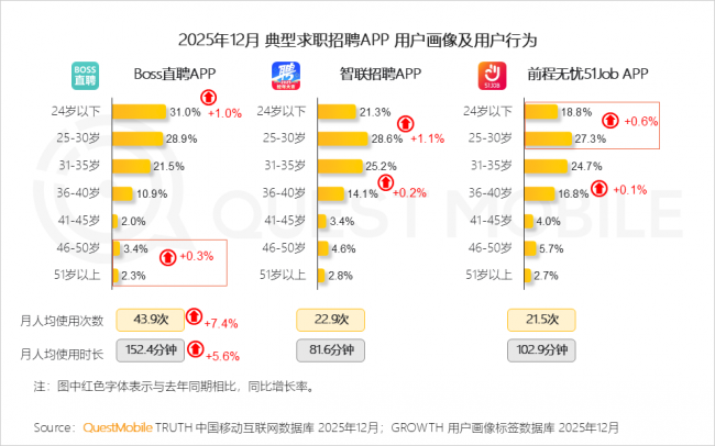 QuestMobile数据显示,2025年12月,Boss直聘、智联招聘和前程无忧51Job APP在年轻用户群体的占比均有不同程度的小幅增长。