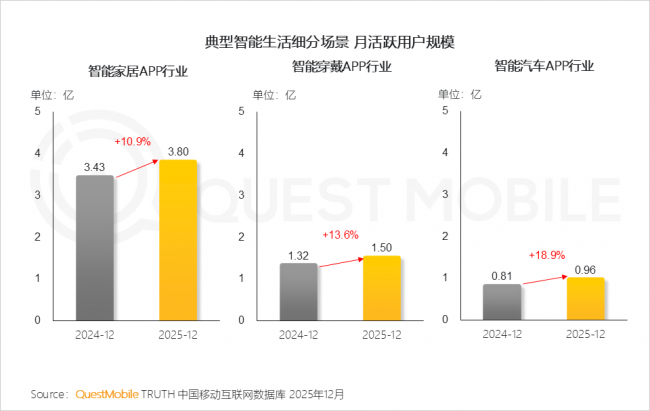 QuestMobile数据显示,智能家居、智能穿戴、智能汽车APP行业月活跃用户规模分别达到3.8亿、1.5亿和9600万,同比增长率分别为10.9%、13.6%和18.9%。