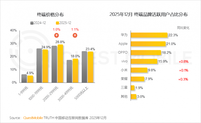2.2 中高价位段手机市场持续扩容;华为领跑,vivo、荣耀、小米终端品牌活跃占比稳步提升