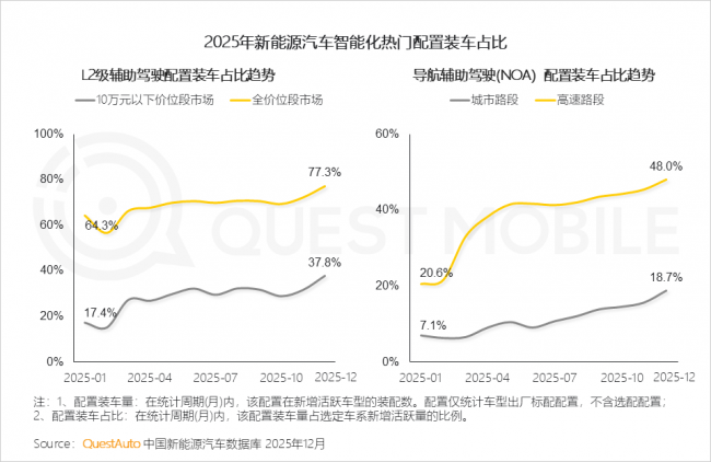 中国新能源汽车数据库QuestAuto数据显示,新能源汽车全价位段L2级辅助驾驶渗透率稳定在70%以上,10万元以下市场持续提升至37.8%,智能辅助驾驶正加速向大众消费市场普及;与此同时,智能辅助驾驶核心战场从高速路段向城市道路拓展。