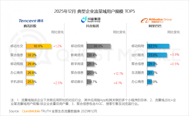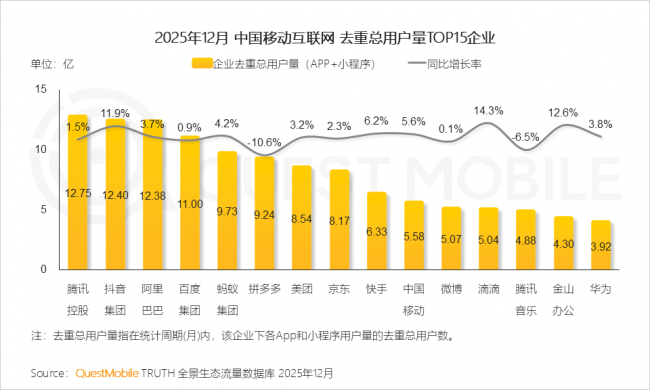 QuestMobile数据显示,截止2025年12月,腾讯控股、抖音集团、阿里巴巴企业流量均超12亿,滴滴、金山办公、抖音集团等增长显著。