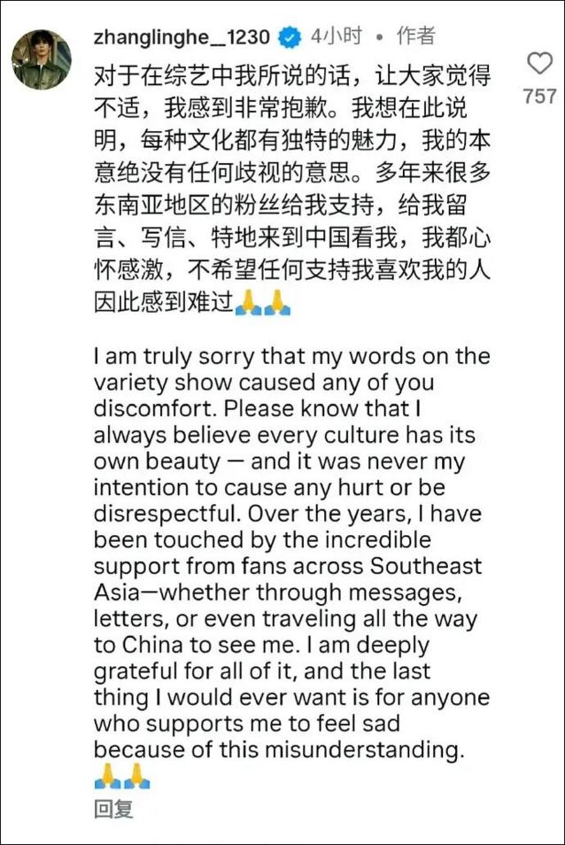 近日,张凌赫在综艺节目《你好星期六》游戏环节中,因评价画像时提及“像出生在东南亚(的人)”在海外地区引发争议,被指涉及地域刻板印象。3月10日,张凌赫在Instagram平台发文道歉,称“本意没有任何歧视意思”,同时表示“不希望任何支持我喜欢我的人因此感到难过”。