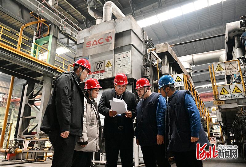 3月2日,河北科技大学教授苏孺(左三)与河冶科技股份有限公司工作人员进行技术交流,解决生产难题。