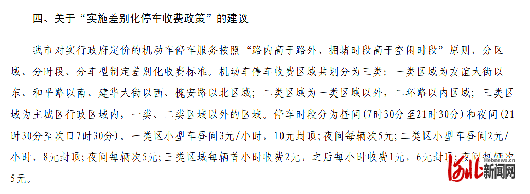 记者在石家庄市人民政府官网看到,石家庄市现行停车收费政策中,政府定价停车场实行分区域收费,一类区域昼间每小时3元、10元封顶,二类区域昼间每小时2元、8元封顶,三类区域昼间首小时2元、之后每小时1元、6元封顶,所有实行政府定价的停车场均提供不少于20分钟的免费停放时间,医疗机构配套停车场免费时长则延长至60分钟。