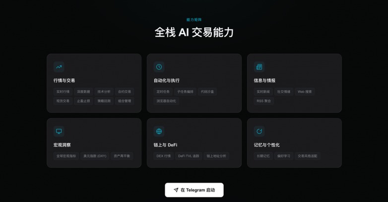 GetClaw是 Bitget 推出的全球首个开箱即用 AI 交易自主智能体。用户无需安装任何软件,在 Telegram 中直接对话即可使用。它具备实时行情、技术分析、信息检索、代码执行、定时任务等 100 项能力,覆盖行情监控、策略分析、市场情报、自动化任务等多个交易场景。