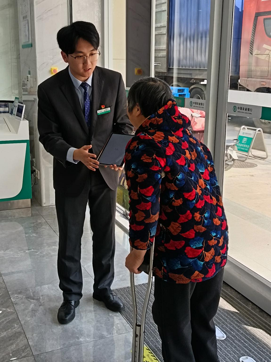经了解,老人年事已高,行动极为不便,因办理定期转存业务专程前来。考虑到老人身体状况,经理当即启动绿色通道,全程陪同搀扶,优先为老人办理业务,省去排队等候的繁琐。办理过程中,工作人员耐心细致、动作轻柔,快速高效完成业务办理,全程贴心陪护、悉心照料,让老人倍感温暖。