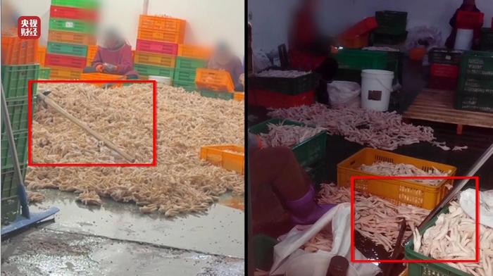 在这个车间里,大量鸡爪直接裸露堆放在潮湿肮脏的地面上,扫帚、铁锹等清洁工具随意压放在鸡爪之上。即便鸡爪被人踩踏,工人也只是随手捡起,直接放回加工筐中继续使用,完全无视食品卫生安全。
