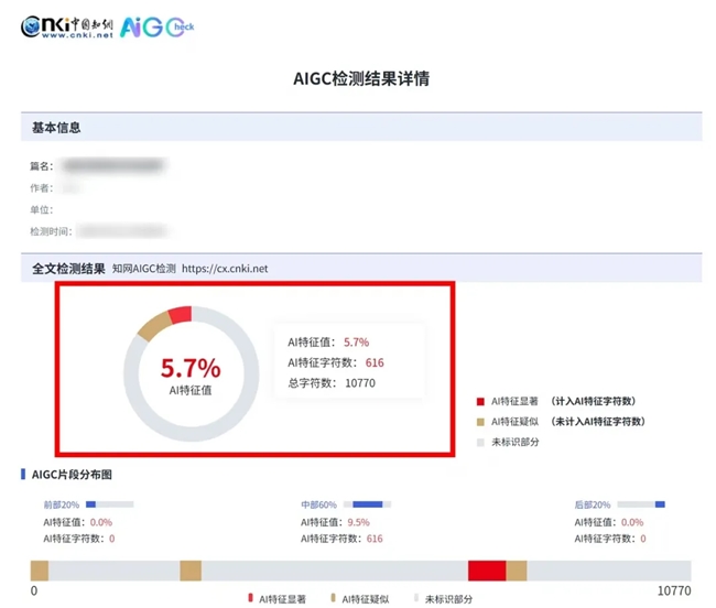 我那篇92%AI检测率的初稿(法学综述,里面全是法条和专业名词),用它跑了一遍直接干到了5.7%,远低于各大高校对AIGC检测率的要求。