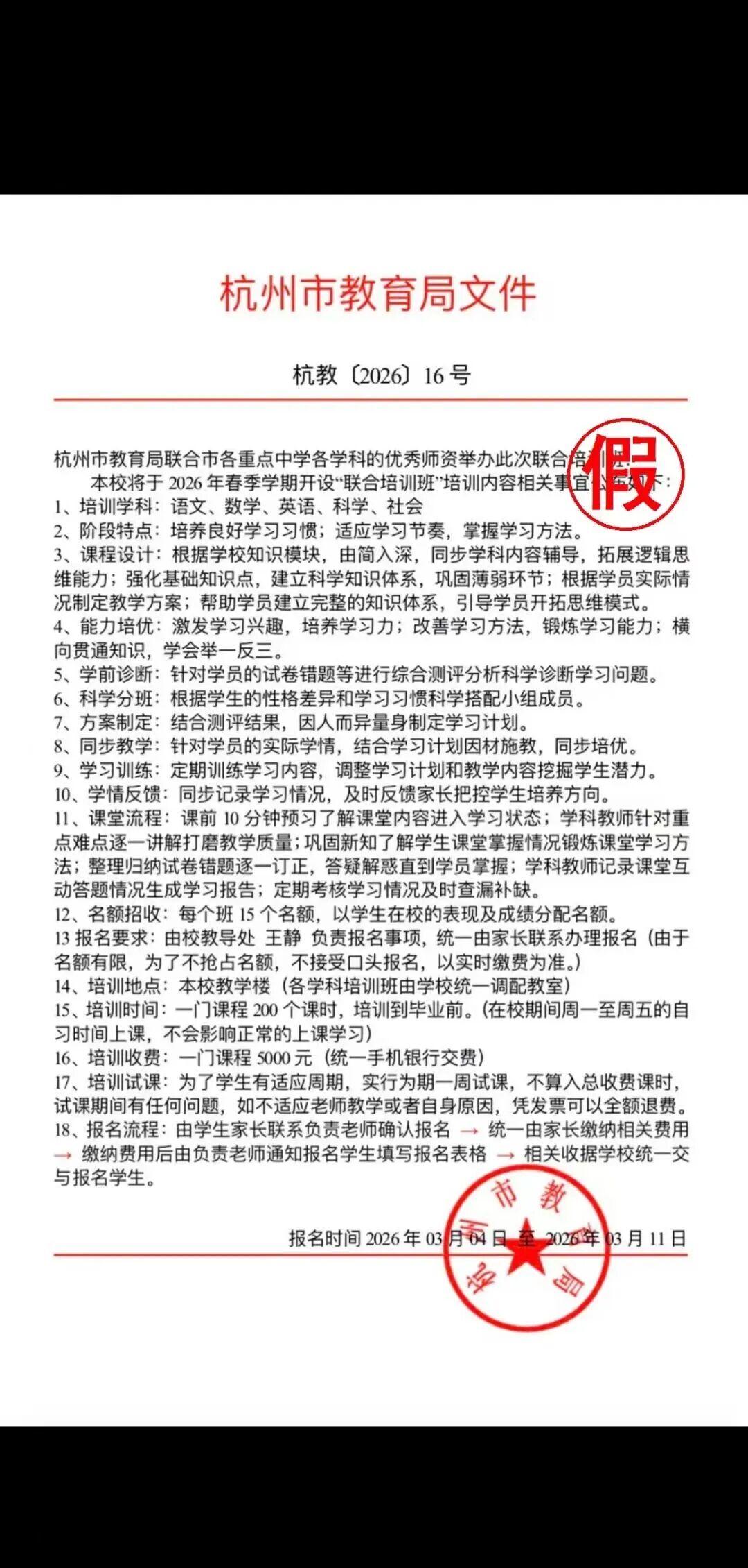 近日,有家长反映收到一份名为《杭州市教育局文件》(文号“杭教〔2026〕16号”)的所谓“联合培训班”招生通知,经核实,该文件系不法分子冒用杭州市教育局名义伪造发布,内容纯属虚构,请家长朋友切勿相信!