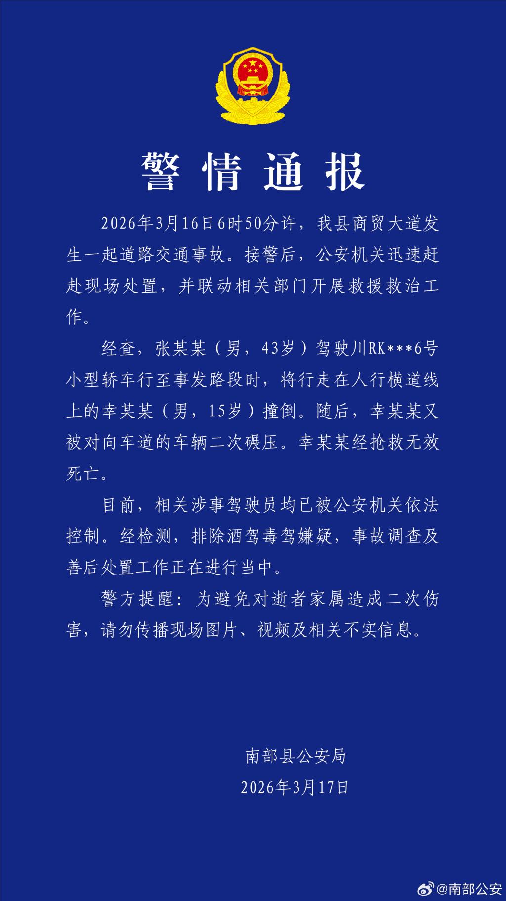 华商网讯 3月17日,四川省南部县公安局发布警情通报: