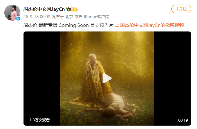 3月18日零点刚过,周杰伦在社交平台发布了新专辑的预告短片,仅19秒。