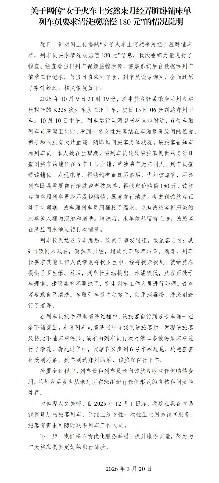 3月20日下午,兰州客运段就此事发布情况说明,并就相关问题进行回应,“处置全过程中,列车长和列车员未向该旅客收取任何赔偿费用,兰州客运段也从未对所在班组进行任何形式的考核和问责等处罚。