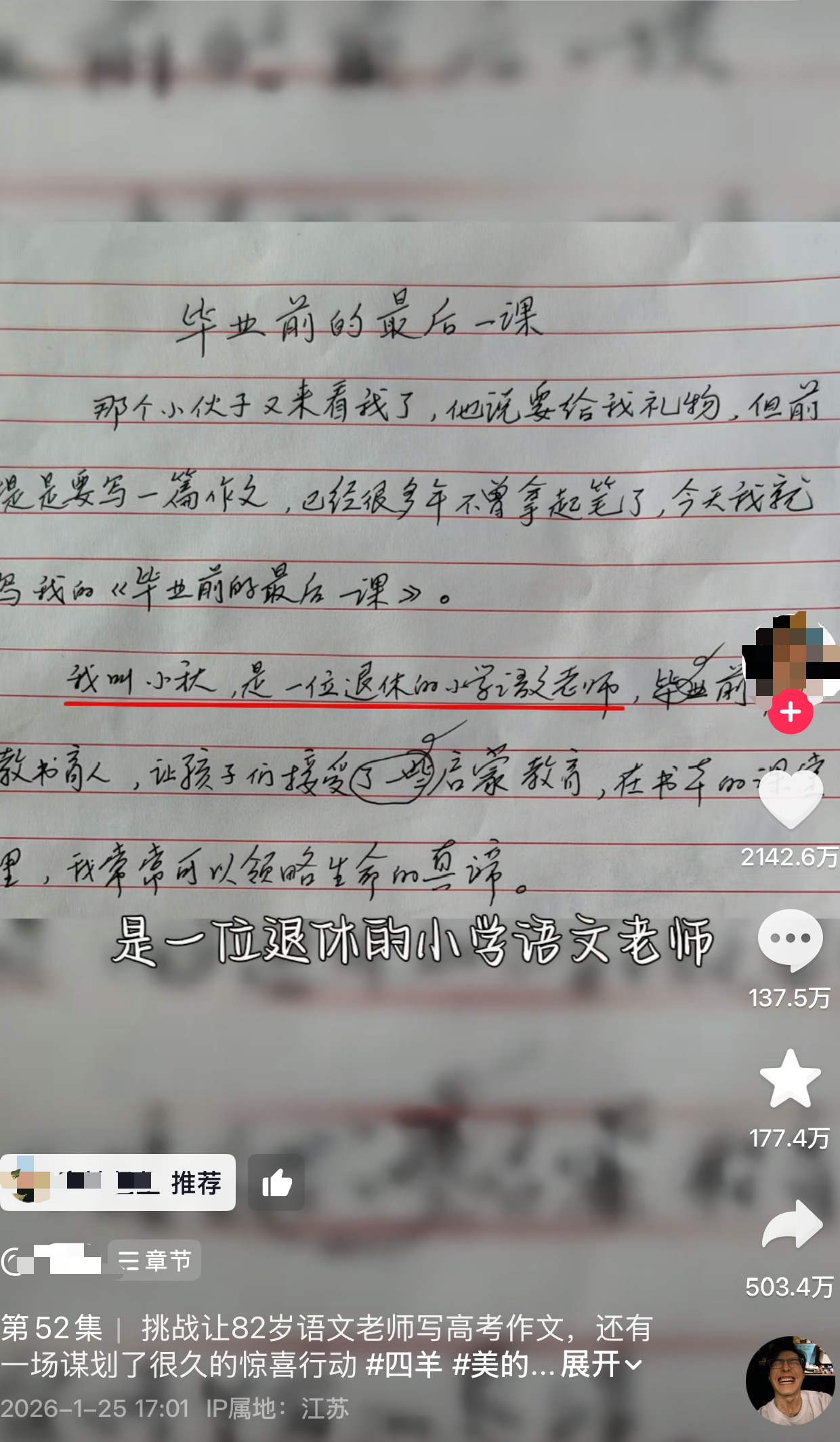 今年1月底,一位短视频博主记录下马鞍山市82岁的退休语文教师章小秋——网友口中的“小秋老师”——一篇题为《毕业前的最后一课》的作文,让无数人为之动容。一场关于爱与守护的故事,就这样悄悄走进了大众的视野。