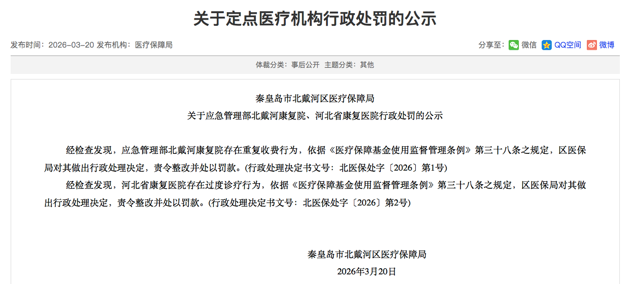 经检查发现,应急管理部北戴河康复院存在重复收费行为,依据《医疗保障基金使用监督管理条例》第三十八条之规定,区医保局对其做出行政处理决定,责令整改并处以罚款。(行政处理决定书文号:北医保处字〔2026〕第1号)