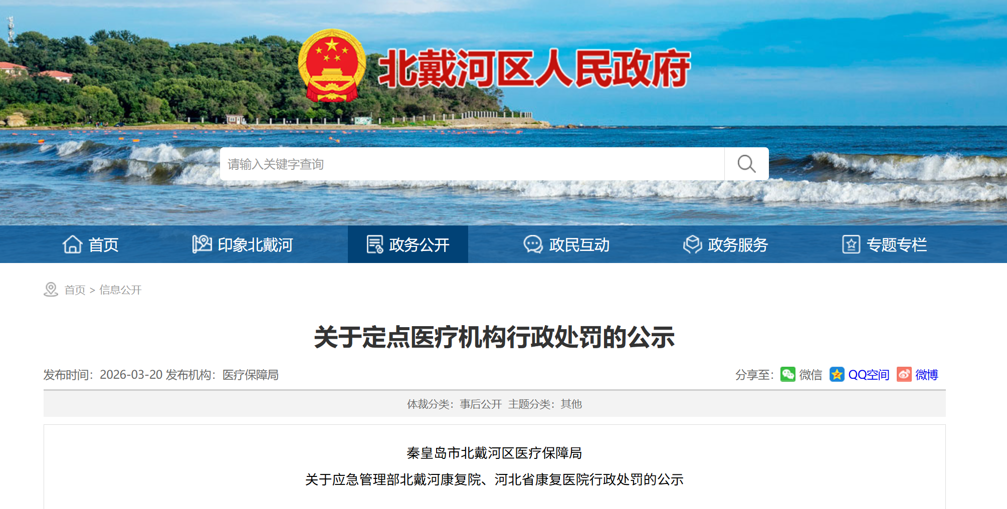 秦皇岛市北戴河区医疗保障局关于应急管理部北戴河康复院、河北省康复医院行政处罚的公示