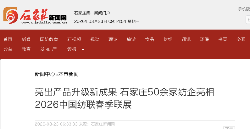 在刚刚结束的2026中国国际纺织面料及辅料(春夏)博览会上,石家庄50余家纺织服装企业携创新纱线、尖端面料、功能性服饰等不同类型多款新品参展,集中展现了石家庄纺织产业的创新活力与产业积淀,抢抓海内外合作商机。