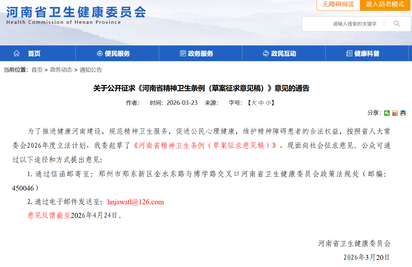 大河网讯 心里烦了、堵了、不得劲了,这些事儿以后在河南,将会有更细的法律来管。近日,河南省卫生健康委起草了《河南省精神卫生条例(草案征求意见稿)》(以下简称“草案”),现在正面向社会公开征求意见。