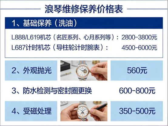 以经典的L888或L619机芯为例(常见于名匠系列、心月系列等表款),保养价格为2800至3800元。L687计时机芯(如导柱轮计时腕表),因组件繁多、调校难度更高,单次保养耗时相应延长,所以价格在4500到6000元。