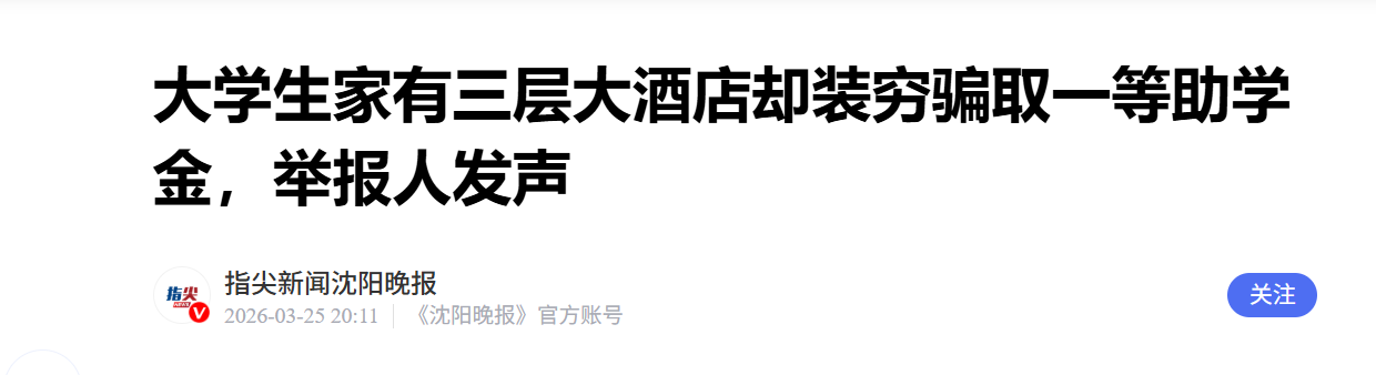 省长信箱的回告根据该截图内容,一位申姓同学于2026年2月20日通过河北省信访局反映河北金融学院学生张某骗取国家助学金的问题。申同学举报张某:隐瞒真实家庭经济状况、虚构贫困、骗取国家助学金4800元;家中经营三层酒楼,具备稳定且明显高于普通家庭的经营收入与资产条件,完全不符合国家助学金申请资格。提出让校方高度重视,严查严处,还教育公平。根据截图中校方的回应,接到线索后,学校高度重视,成立专项工作小组,采取查阅助学金申请材料、调查学生、约谈家长、实地家访等调查措施。于2026年2月17日查明张某存在隐瞒家庭经济情况问题。2026年2月19日,学校依校规校纪作出处理:撤销其国家助学金评定资格,追回其已发放助学金,并给予记过处分。3月24日,记者辗转联系到举报人申同学。他说,上述省长信箱的回告属实。他在河北金融学院上大三,举报的是同班的张同学,他打人还装穷骗取国家助学金。申同学称,去年12月2日,因占座发生矛盾,他被同班张同学打伤,当即出现头晕、头痛等不适症状,经检查确诊为头面部外伤,颈部、腰部、背部均存在软组织挫伤,目前仍在家休养。张某被警方行政处罚,罚款500元。