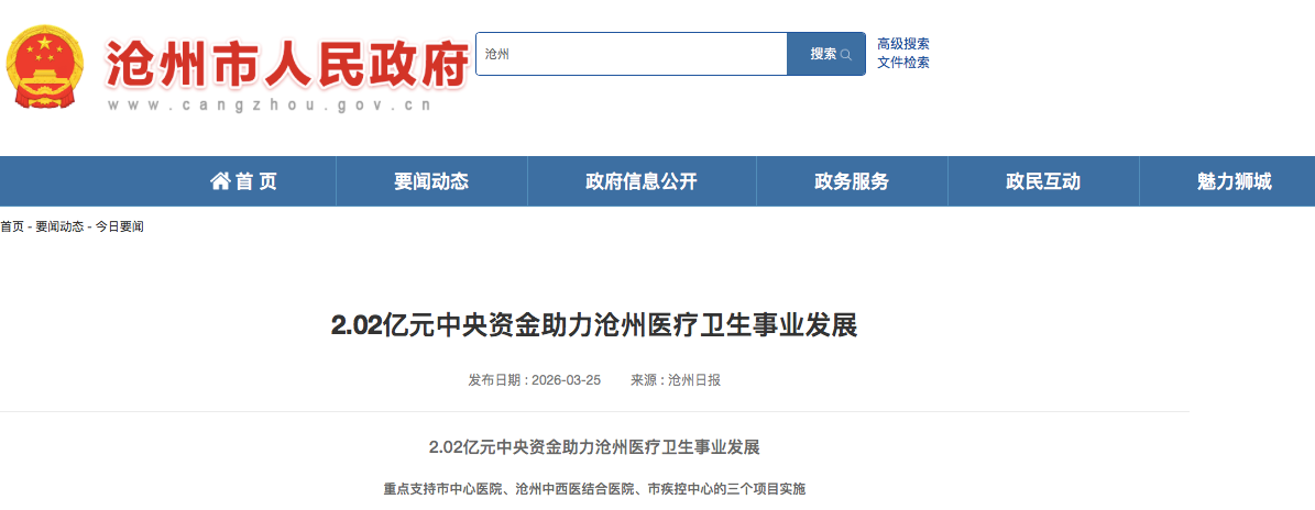 近日,国家发展改革委下达2026年第一批医疗卫生服务体系建设中央预算内投资计划,沧州市获批中央资金2.02亿元,获批额度位居全省第一。