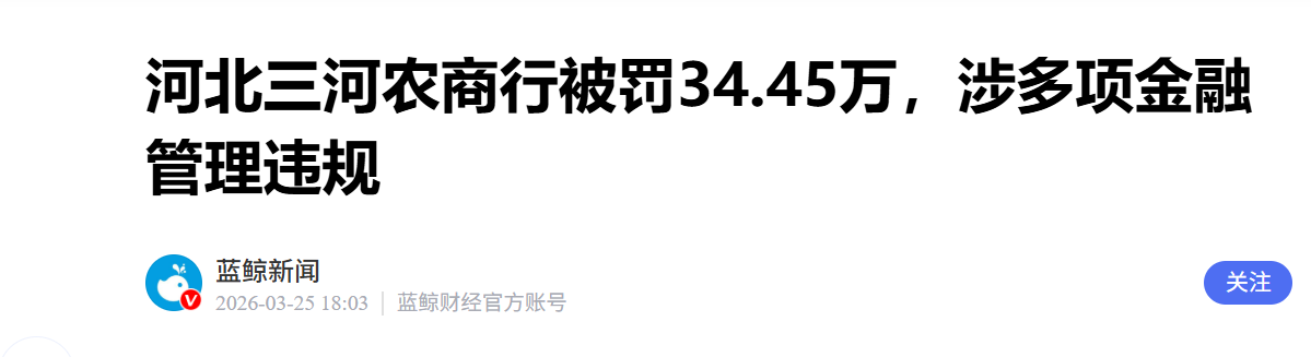 蓝鲸新闻3月25日讯,近日,中国人民银行廊坊市分行发布了一则行政处罚决定信息公示表,剑指河北三河农村商业银行股份有限公司。