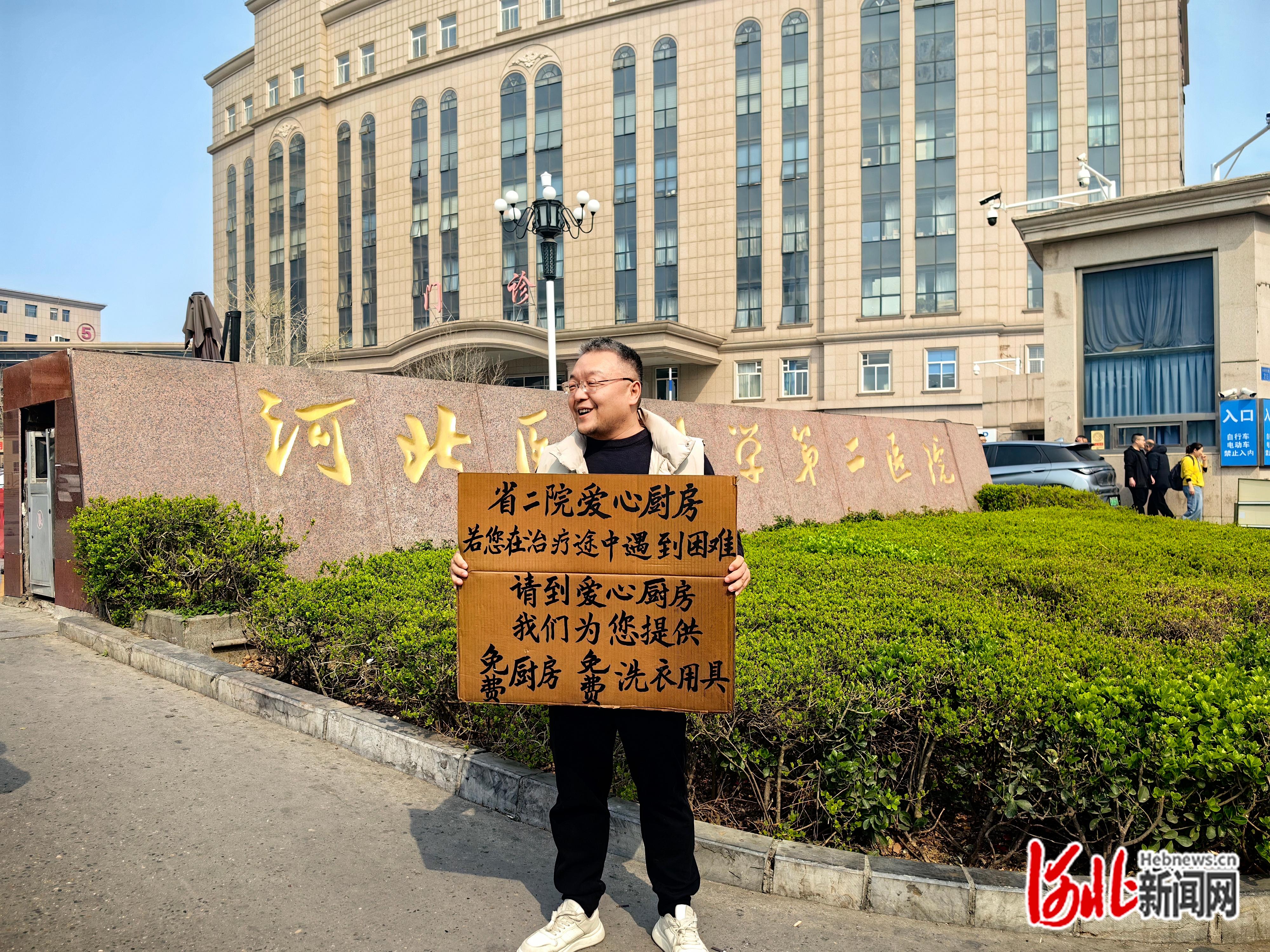 在河北医科大学第二医院总院(以下简称省二院)门口,时常能见到一位中年男子手持醒目告示牌“招揽客人”。牌子上的字格外暖心:“省二院爱心厨房,若您在治疗途中遇到困难,请到爱心厨房,我们为您提供免费厨房、免费洗衣用具。”这间藏在医院附近的爱心厨房,开放不足半年,已让近1500名病患及家属吃上了热乎的家常饭,在奔波的求医路上,收获了久违的温暖与希望。