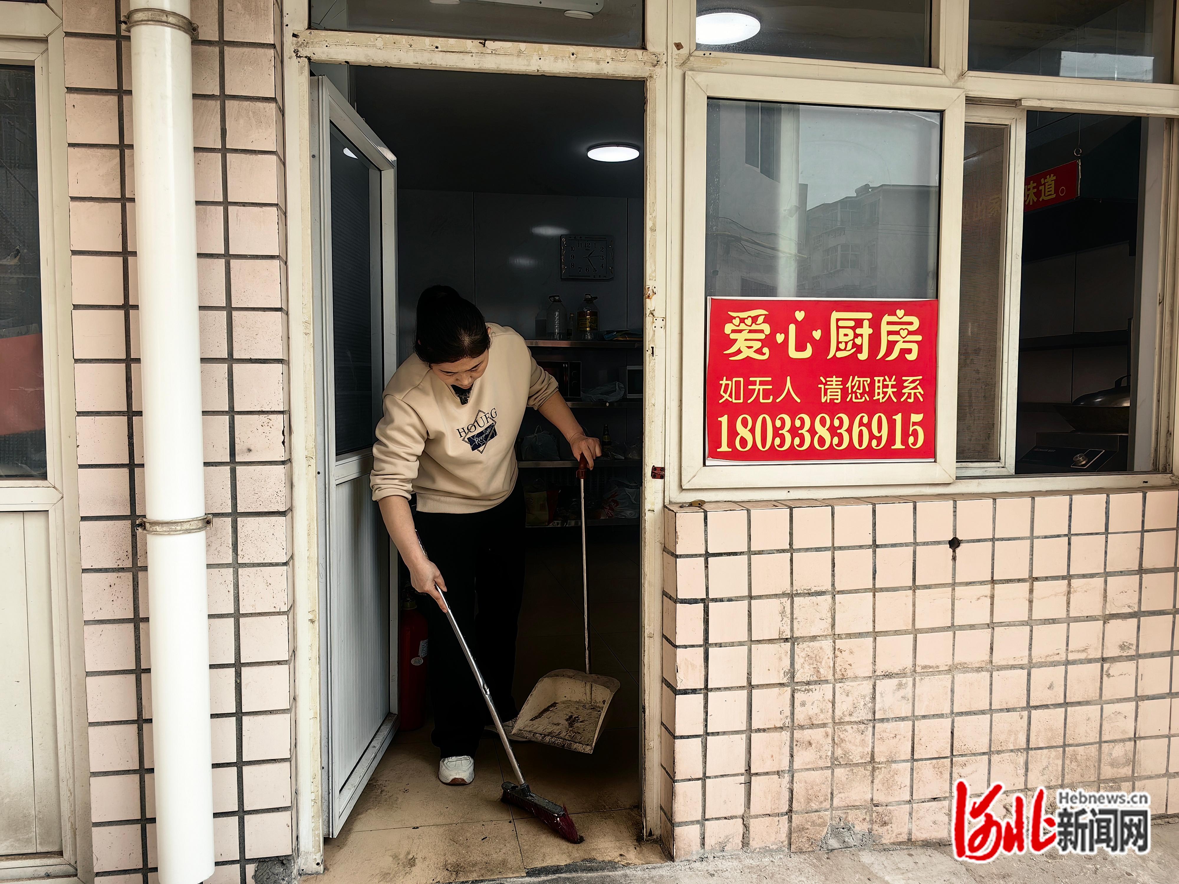 林凤做晚饭后在爱心厨房打扫卫生。袁欣悦摄