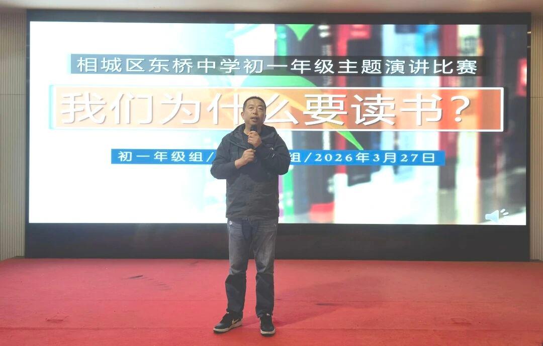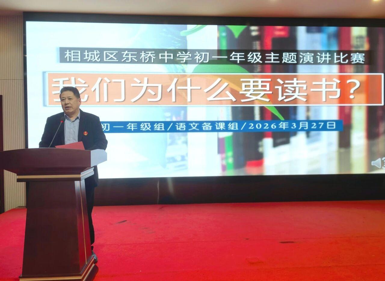 江南时报讯 笔墨润心,声韵传情。为引导学子探寻读书的意义,涵养书香校园的深厚底蕴,3月底,苏州市相城区东桥中学初一年级“我们为什么要读书”主题演讲决赛在崇礼楼科德报告厅温情启幕、圆满落幕。受邀校领导、初一年级师生、家长代表齐聚一堂,共赴一场以声音为媒、以书籍为友的心灵之约,在赤诚的表达中,解锁读书的万千价值,书写青春与成长的诗意篇章。