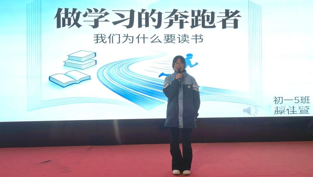活动中,语文教研组长王春宝致辞,对同学们以演讲形式回应“我们为什么要读书”这一经典之问,寄予了深切期许与由衷肯定。他深情说道:“‘我们为什么要读书’,这是穿越千年、叩击每一代少年心灵的经典之问,它没有标准答案,却有千万种真诚的回响。今天,我很欣慰地看到,你们选择用演讲这最赤诚、最有力量的方式,去探寻、去表达、去诠释这份答案。演讲是心声的传递,是思想的碰撞,更是你们与书籍对话、与自我对话的最好方式,愿你们放下拘谨、敞开心怀,用声音传递对读书的热爱,用感悟书写对成长的思考,在表达中读懂读书的意义,在诉说中汲取前行的力量。”