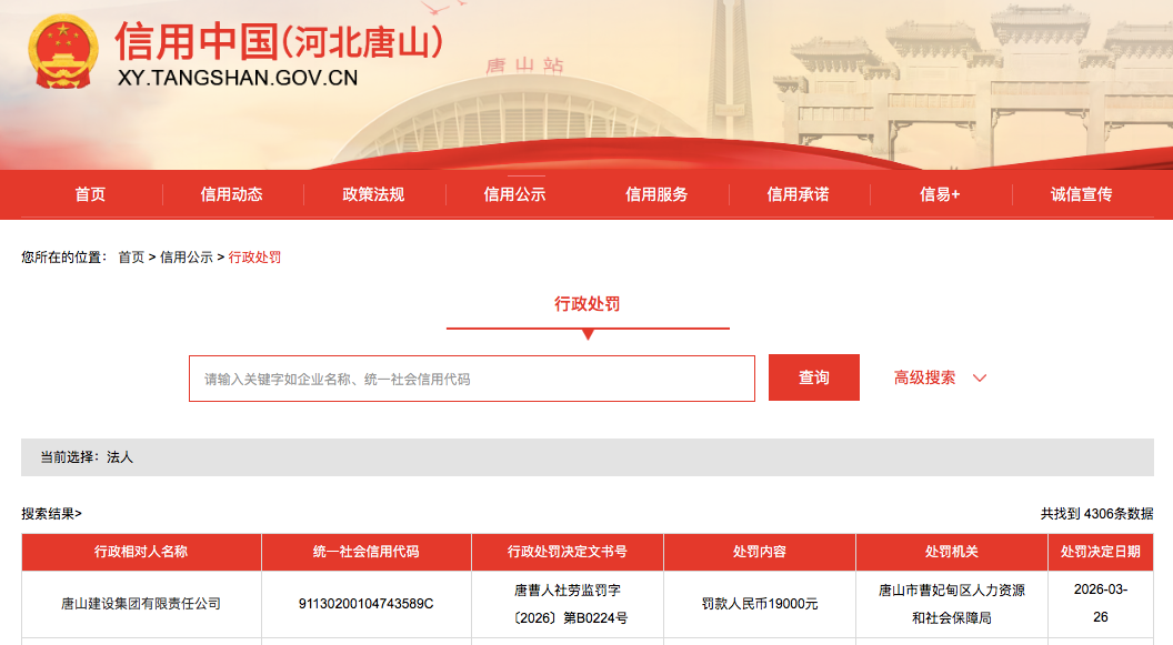 据信用中国(河北唐山)官网公示信息,2026年3月26日,因拖欠68名农民工工资113万余元,唐山建设集团有限责任公司被唐山市曹妃甸区人力资源和社会保障局处以罚款1.9万元。