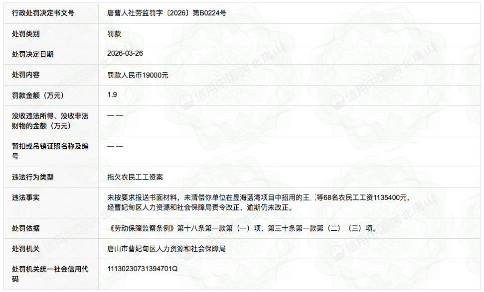 文号“唐曹人社劳监罚字〔2026〕第B0224号”行政处罚决定书显示,唐山建设集团有限责任公司未按要求报送书面材料,未清偿该单位在昱海蓝湾项目中招用的王某等68名农民工工资1135400元(113.54万元),经曹妃甸区人力资源和社会保障局责令改正,逾期仍未改正。