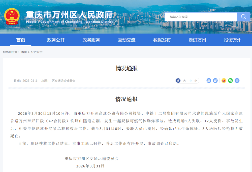 中国网3月31日讯 据重庆市万州区人民政府网站消息,重庆市万州区交通运输委员会发布情况通报2026年3月30日15时10分许,由重庆万开达高速公路有限公司投资、中铁十二局集团有限公司承建的恩施至广元国家高速公路万州至开江段(A2合同段)铁峰山隧道左洞,发生一起疑似可燃气体爆炸事故,造成现场1人失联、12人受伤。事故发生后,相关单位迅速开展紧急救援救治工作。截至3月31日0时,失联人员已找到、经确认已无生命体征,3人送医后经抢救无效死亡。