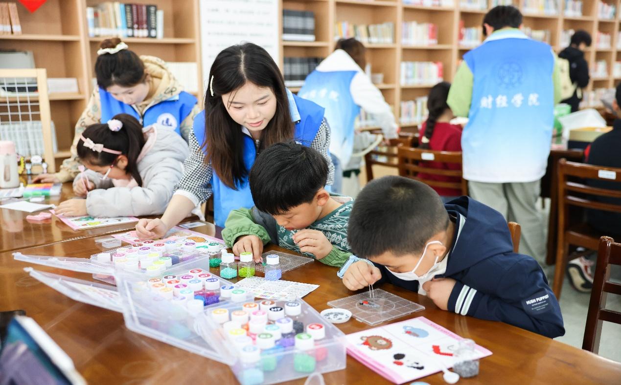 无锡职大财经学院以女生居多,近年来以“她力量”为主题开设了系列手作疗愈活动,已经走出校园、服务社区。春假期间,位于图书馆的承泽书苑,成为女孩子们的“手作疗愈基地”,扭扭棒特色造型、创意拼豆挂件吸引了60余名教职工子女报名。“我做的冰激凌造型,姐姐一点一点教我扭出来然后组装。”一年级女生吴以涔兴奋地向记者介绍她的作品。辅导员郑文彧介绍,他们精心挑选了上手容易、颜值高的作品给小朋友们参考,尤其是需要耐心操作的创意拼豆,可以让孩子们安安静静地玩很久。