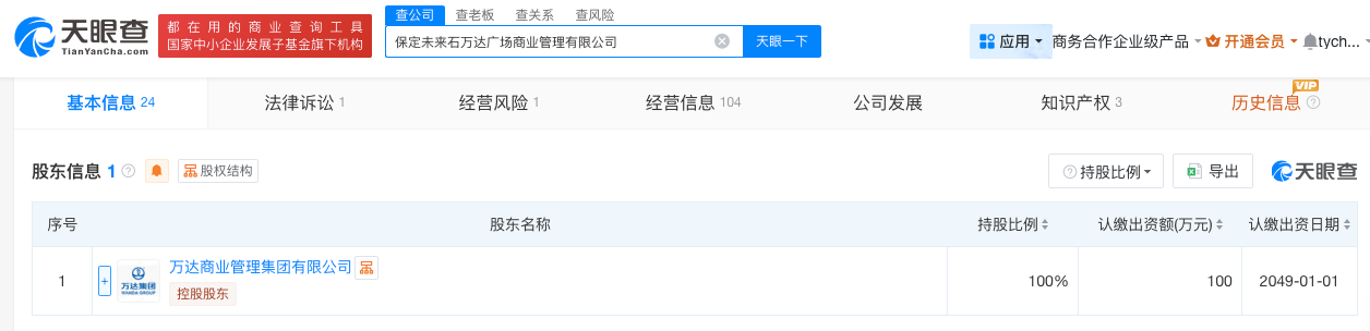 天眼查显示,保定未来石万达广场商业管理有限公司,成立于2019年,大连万达商业管理集团成员,位于河北省保定市莲池区七一东路1999号未来石3号楼,是一家以从事商务服务业为主的企业。企业注册资本100万元,持股100%股东为万达商业管理集团有限公司(万达集团旗下公司)。
