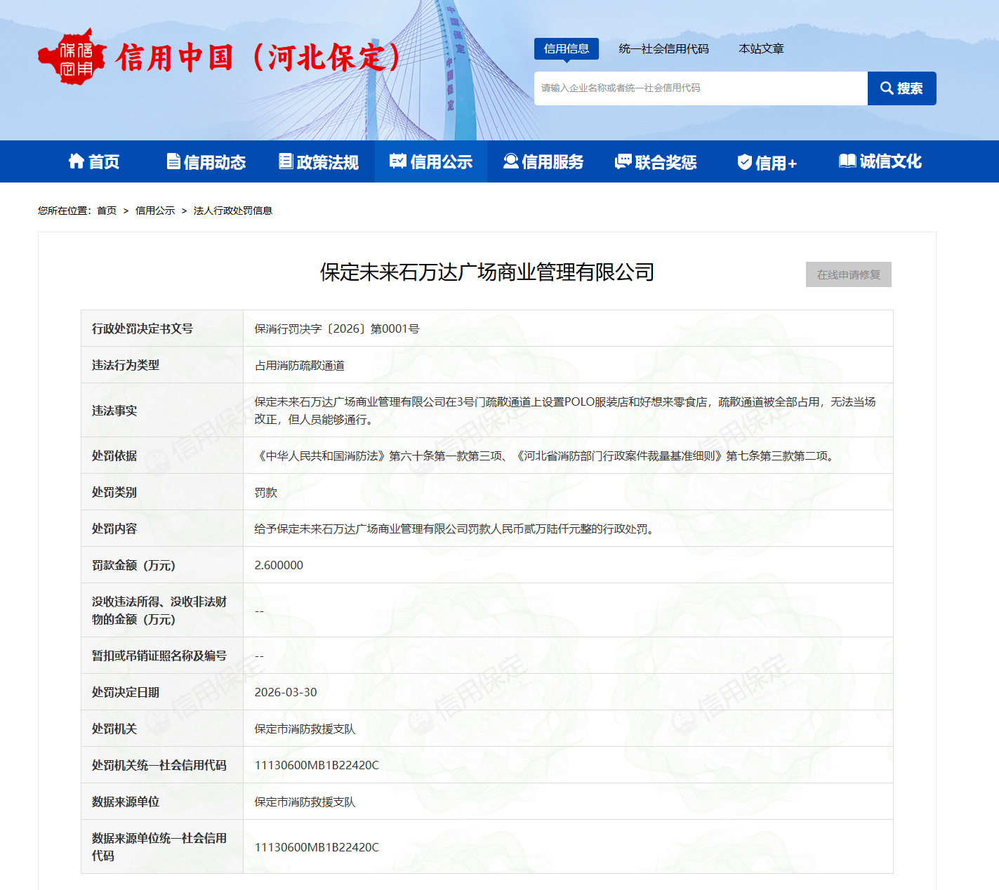 据信用中国(河北保定)官网公示信息,2026年3月30日,因占用消防疏散通道,保定未来石万达广场商业管理有限公司被保定市消防救援支队处以罚款2.6万元。