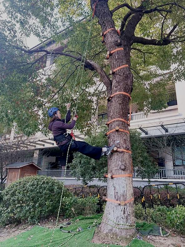 整堂攀树课上,体育教师张诗雯都在一旁稳稳地拉住安全绳。毕业于厦门大学的她,大二时就加入了学校攀树队,已有近10年的攀树经验。此前,她作为攀树专家,与钱塘区教育局一起制定攀树指导手册,并参与区内体育教师的培训工作。在张诗雯看来,攀树运动除了能锻炼学生的手脚协调性、提升自信心,更重要的是与运动器械相比,攀树运动利用的是大自然中真实的大树,“接触它、依靠它,会让人对自然产生亲近感”。