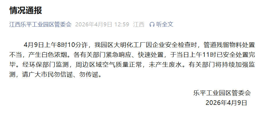 中国网4月9日讯 据江西乐平工业园区管委会微信公众号消息,乐平工业园区管委会4月9日发布情况通报:4月9日上午8时10分许,该园区大明化工厂因企业安全检查时,管道残留物料处置不当,产生白色浓烟。各有关部门紧急响应、快速处置,于当日上午11时已安全处置完毕。