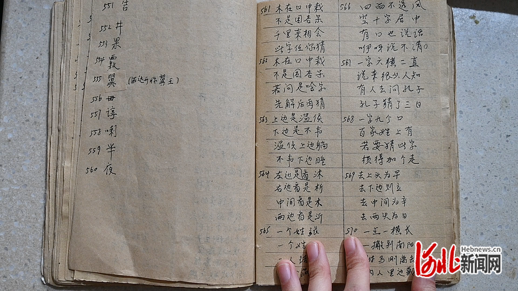 据刘俊田的女儿刘倩介绍,老人与字谜的缘分,始于1992年当地举办的一场谜语大会。“父亲当年去看了这场谜语大会,看完就入迷了,从那以后就开始自己琢磨着写字谜,这一坚持,就整整34年。”她说。