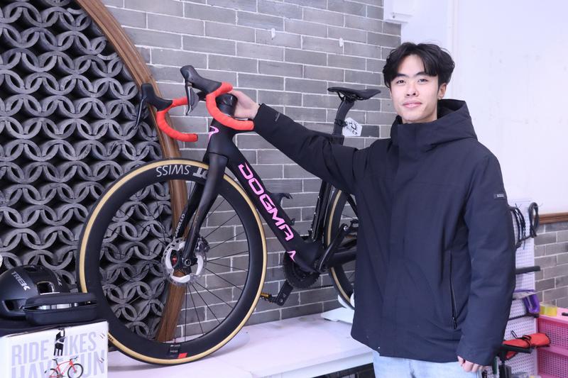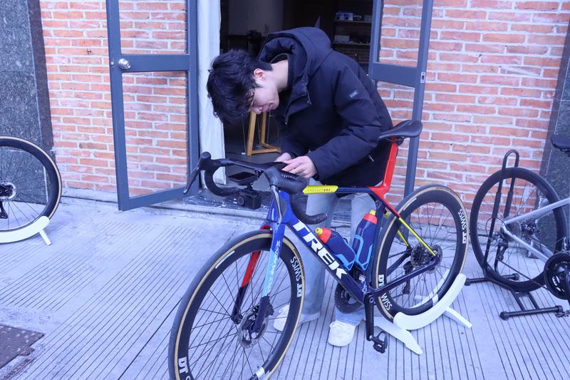 邓富杰在调试自行车。受访者供图