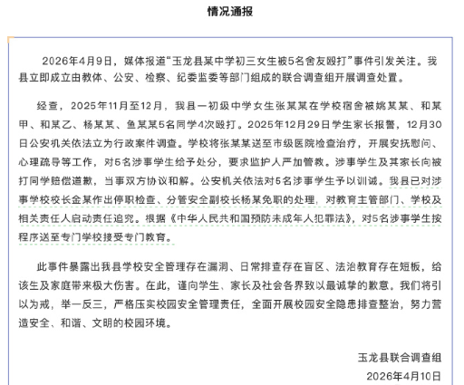 中国网4月10日讯 云南省玉龙县联合调查组4月10日发布情况通报:4月9日,媒体报道“玉龙县某中学初三女生被5名舍友殴打”事件引发关注。玉龙县立即成立由教体、公安、检察、纪委监委等部门组成的联合调查组开展调查处置。