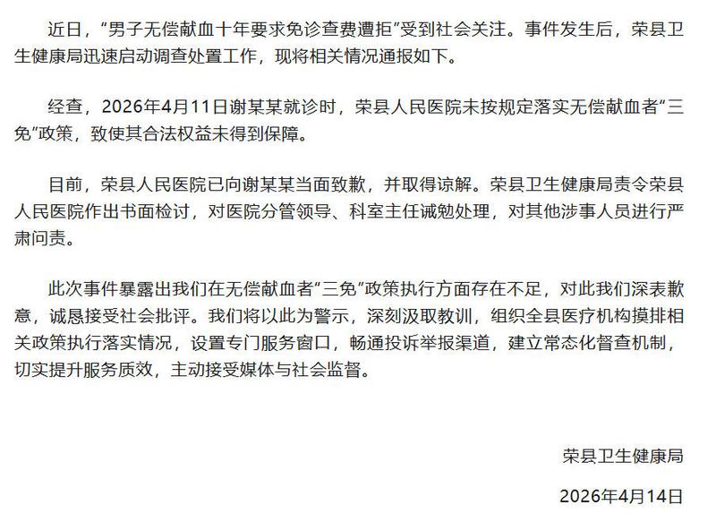 中新网4月14日电 据“荣县人民医院”微信公众号消息,4月14日,四川省荣县卫生健康局发布情况通报称,近日,“男子无偿献血十年要求免诊查费遭拒”受到社会关注。事件发生后,荣县卫生健康局迅速启动调查处置工作。
