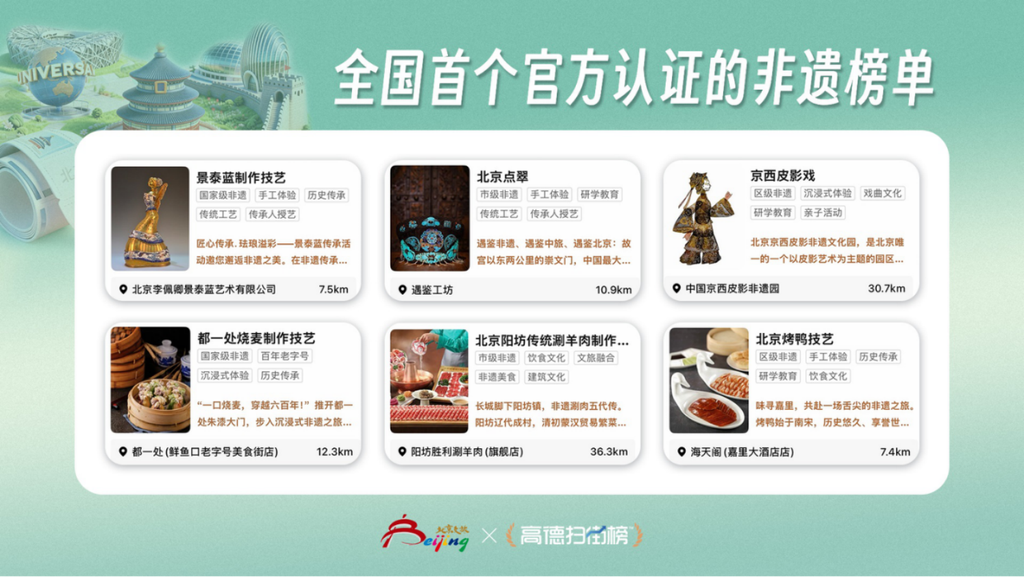 其中最受关注的是,这份非遗榜单不同于平台自评和小编推荐,是由北京市文化和旅游局认证的非遗指南。该榜单分为"京彩非遗游"、"非遗美食"两大板块,涵盖120项国家级、市级、区级非遗项目,既有传统技艺、民俗文化,也有非遗老字号美食,让非遗从“文化符号”转变成可深度体验的真实目的地。