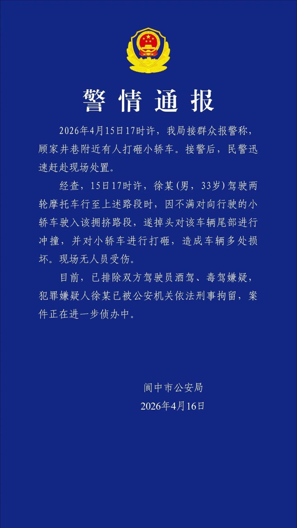 2026年4月15日17时许,阆中市公安局接群众报警称,顾家井巷附近有人打砸小轿车。接警后,民警迅速赶赴现场处置。