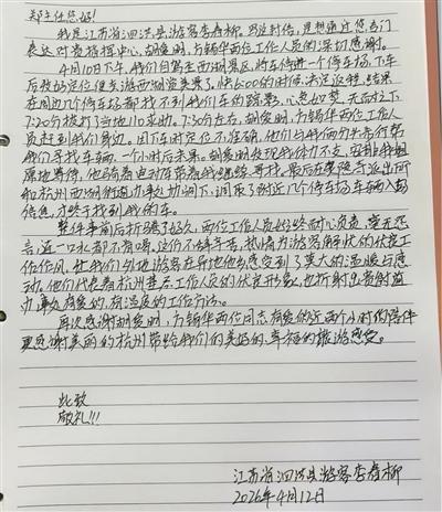近晚上9点,李女士的车终于找到了。李女士说,他们只是保安,做着最基层的工作,忘记车停在哪里是我的原因,“但是他们丝毫不抱怨,基层的保安工作状态让我感受到了杭州的友好,到家后,我搜索了杭州媒体的电话,希望能传达对他们的表扬。”