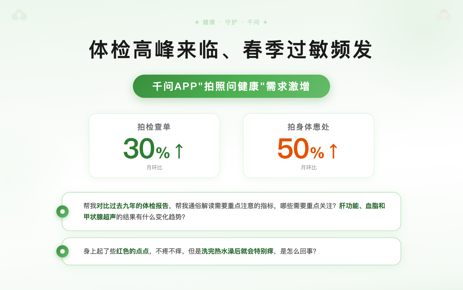 4月17日,来自千问APP的数据显示,受体检季和春季过敏高发叠加影响,用户“拍照问健康”的行为明显增加。其中,拍检查单进行解读的需求月环比增长超过30%,而针对皮肤等症状的拍照咨询需求增幅更高,超过50%。