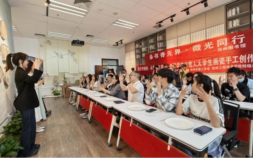 4月18日上午,郑州图书馆西四楼“郑风雅韵”艺术空间,“瓷绘丹青”手绘瓷器体验活动——“书香无界・微光同行”专场圆满举办。郑州市残疾人联合会、郑州市聋人协会、郑州工程技术学院特殊教育学院,组织30名聋人大学生沉浸式参与,以瓷为媒、以笔传情,让传统书画与陶瓷技艺跨越语言障碍,直抵人心。