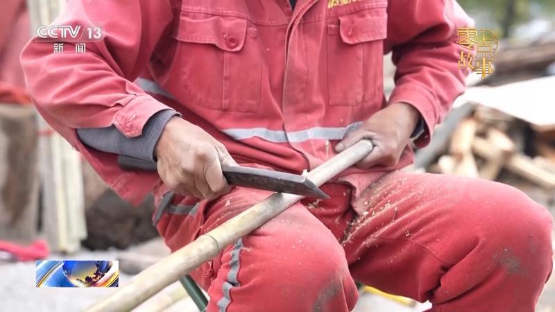 陈粉年用火烤让毛竹变软后,她的丈夫王正祥立即接手,用力将毛竹压直,动作要精准有力,他同时在毛竹压直处泼冷水冷却,起到迅速定型的效果。