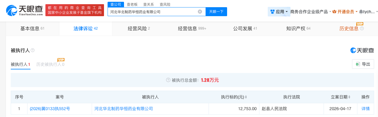 据天眼查显示,2026年4月17日华北制药(600812)控股的河北华北制药华恒药业有限公司新增1条被执行人信息,执行标的约1.28万元。被执行人信息如下: