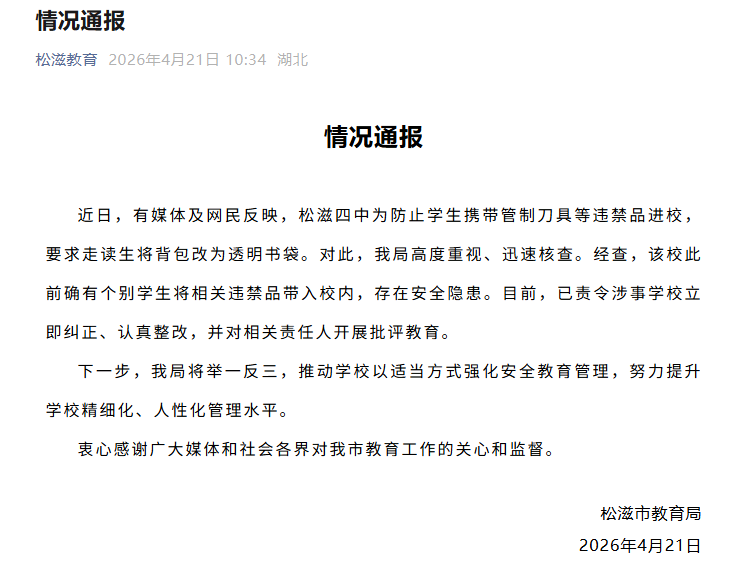 中国网4月21日讯 据“松滋教育”微信公众号消息,湖北荆州松滋市教育局发布情况通报。近日,有媒体及网民反映,松滋四中为防止学生携带管制刀具等违禁品进校,要求走读生将背包改为透明书袋。对此,松滋市教育局高度重视、迅速核查。